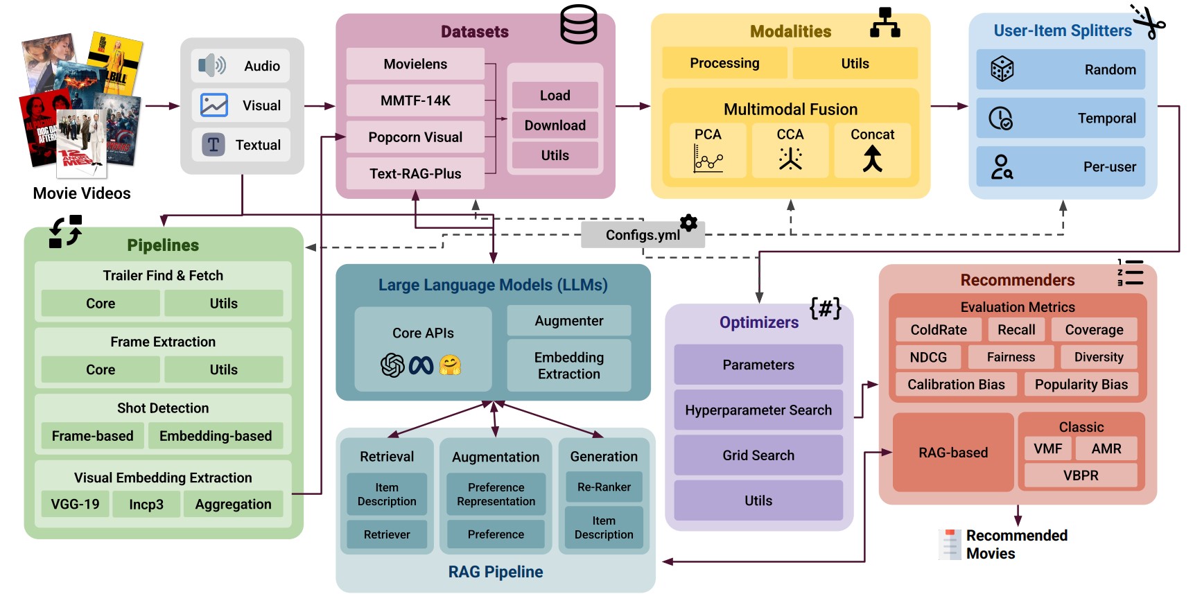 Popcorn is a resource for reproducible multimodal movie recommendation. It standardizes data ingestion, representation construction, model training, and evaluation under controlled configurations. The framework is designed to interface directly with standard interaction benchmarks (e.g., MovieLens 100K, 1M, and 25M), enabling straightforward substitution of the underlying user-item feedback source. To respect copyright restrictions, Popcorn-Visual distributes embeddings rather than raw videos, while the framework provides scripts to (re)compute embeddings when users have lawful access to the underlying content